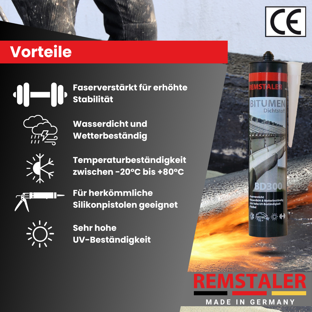 Dieser faserverstärkte Bitumenfugendichtstoff ist ideal für die Reparatur von bituminösen Dächern. Er sorgt dafür, dass Fugen, Nähte, Dachränder, Lichtkuppeln und Regenwasserabläufe wasserdicht sind. Der Dichtstoff ist in einer Kartusche abgefüllt und kann mit einer herkömmlichen Silikonpistole ausgedrückt werden. Dank seiner thixotropen Konsistenz läuft er nicht und bildet keine Fäden. Nach dem Trocknen ist er feuchtigkeitsbeständig, haftet auf fast allen Baumaterialien, bietet UV-Resistenz und ist wetterresistent, was zusätzlichen Schutz gegen verschiedene Witterungsbedingungen gewährleistet.