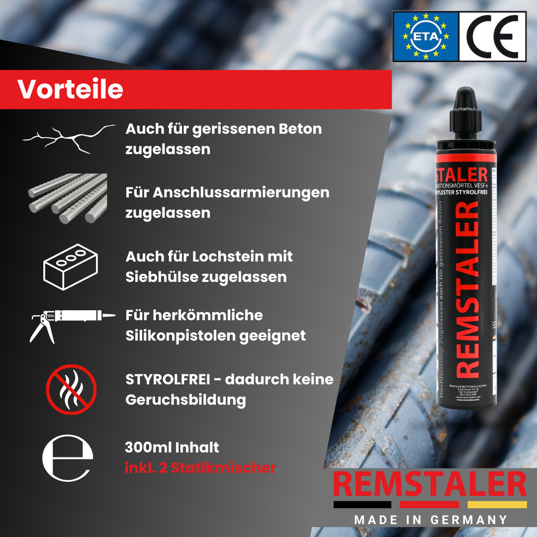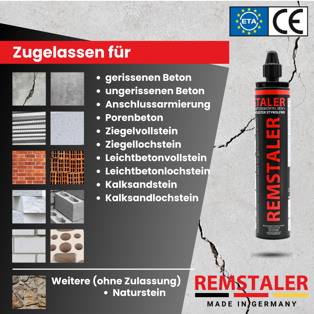 Der Injektionsmörtel VESF+ bietet eine effektive Lösung für die Verankerung von Ankerstangen und Armierungseisen in verschiedenen Untergründen. Durch die ETA option 1 Zulassung auch bei gerissenem Beton anwendbar. Durch seine styrolfreie Formulierung ist er umweltfreundlich und reduziert gesundheitliche Risiken während der Verarbeitung.