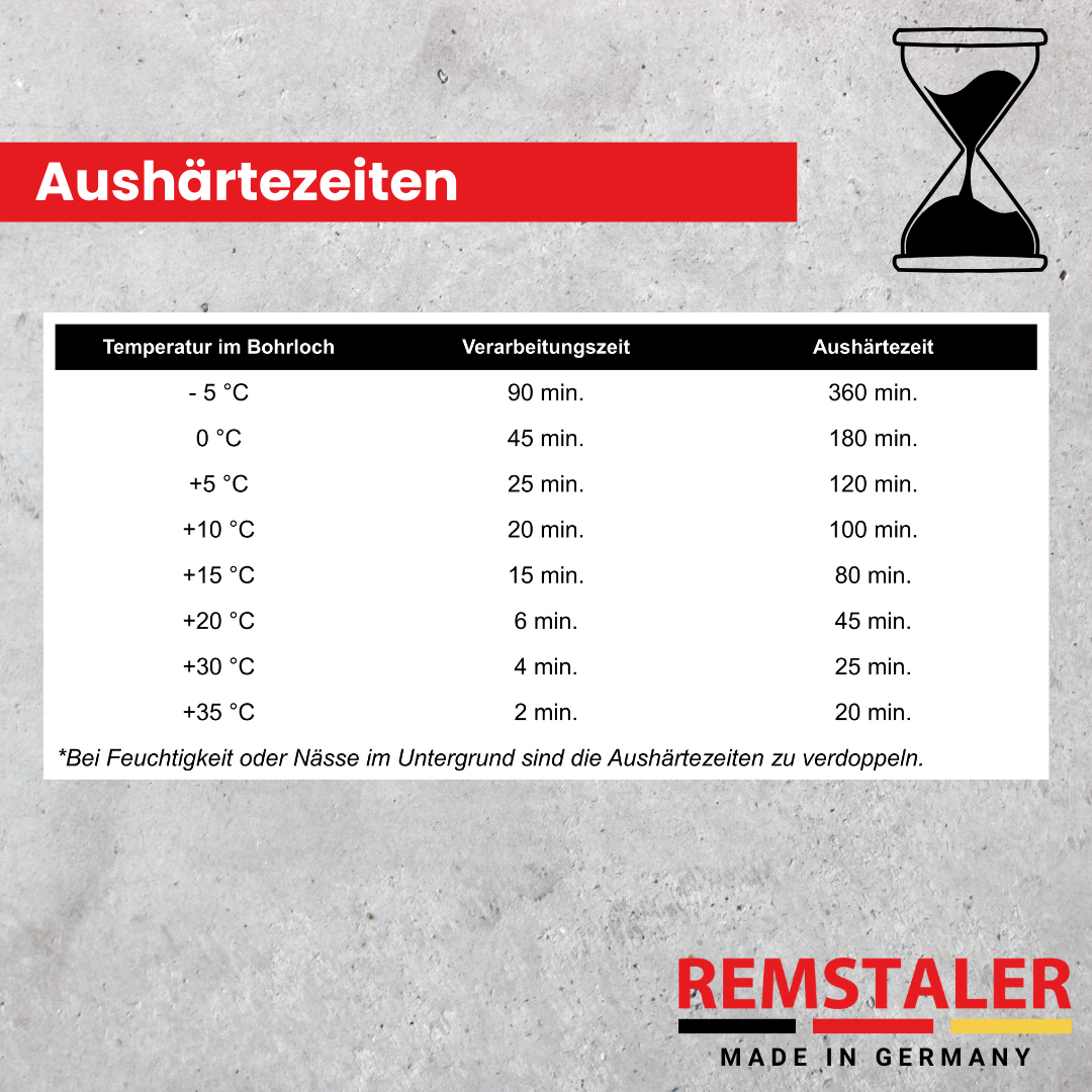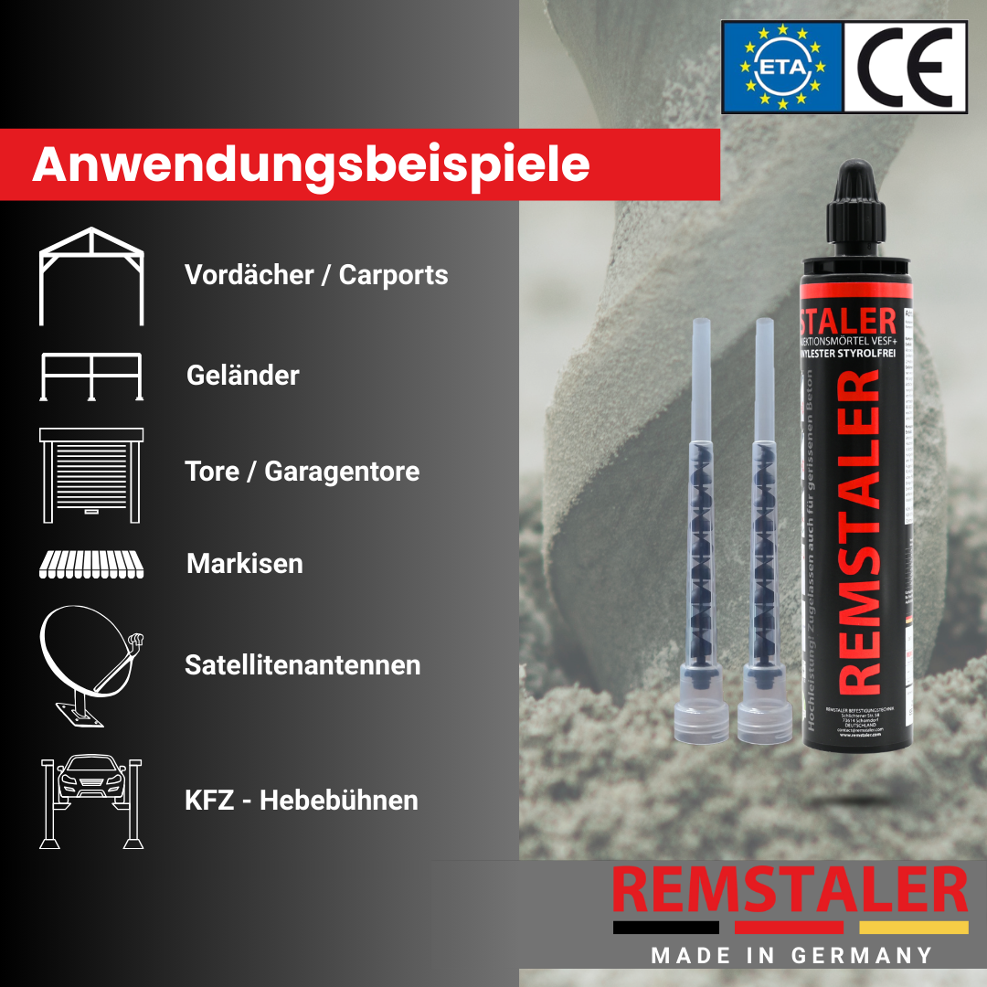 Die Verwendung eines Statikmischers gewährleistet eine gleichmäßige Vermischung der beiden Komponenten, was für die Qualität und Festigkeit des Endprodukts von großer Bedeutung ist. Nach dem Aushärten entsteht eine starke Verbindung, die hohe Lasten aufnehmen kann und für eine dauerhafte Verankerung sorgt.
